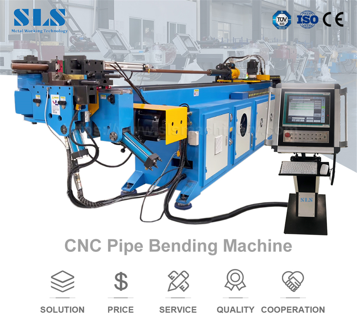 SLS 50 TYPE 3A-1S CNC CNC Hollow Round en acier rond Fabricant Machine de flexion du barre EJ'ai plaisanté avec PLC qui gère la flexion (Y), l'alimentation (x) et la rotation (z) dans un cycle automatique complet.